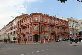 Трёхэтажное здание построено из неоштукатуренного кирпича. Оно имеет в плане Г-образную форму со срезанным углом, где размещается вход. На высоте второго этажа на углу находится эркер, который поддерживают консоли. На третьем этаже эркер завершается балконом. Такие же балконы есть на 2-м и 3-м этажах. Со стороны улицы Володарского ранее была проездная арка, которая вела во двор. Оконные проёмы имеют различную форму: на первом этаже — прямоугольные, на втором — полуциркульные, на третьем — лучковые. Здание украшает декор из кирпичной кладки: пилястры, ниши, карнизы, сандрики. Внутри здание имеет коридорную планировку с большим вестибюлем напротив главного входа[1].