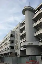 Несущие конструкции здания выполнены из монолитного железобетона, стены кирпичные, оштукатурены цементно-песчаным раствором тёмно-серого цвета. Ленточные окна, опоясывающие стены, придают зданию лёгкость и выразительность[2].