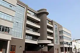 Главный фасад по улице Баумана имеет 3-частное членение и состоит из двух 4-этажных различных по размерам объёмов, расположенных по углам улицы Кави Наджми, пересекающей улицу Баумана, и центрального заглубленного объёма, который представляет собой, начиная со второго этажа переходную галерею с лоджиями, под ней — сквозной проезд[2].