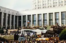 В августе 1991 года Дом Советов стал центром противостояния Государственному комитету по чрезвычайному положению. Оппозицию возглавлял президент России Борис Ельцин[2], в поддержку которого вокруг здания проводили масштабные митинги. В этот период Ельцин неоднократно выступал перед собравшимися, самой известной стала речь, произнесённая 19 августа с танка Таманской дивизии. На тот момент строение опоясывала живая цепь москвичей, поддерживавших президента. Вокруг здания выстраивали баррикады из подручных материалов: мусорных баков, заборов близлежащих парков, скамеек, спиленных деревьев. В эти дни протестанты расписали стены строения граффити на политическую тематику[4][12][13]. К 20 августа у стен сооружения собралось около двухсот тысяч человек, среди которых общественные и политические деятели Руслан Хасбулатов, Иван Силаев, Александр Руцкой, Эдуард Шеварднадзе, Михаил Ходорковский, Мстислав Ростропович, Андрей Макаревич и другие[14].