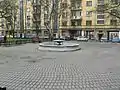 Фонтан в зоне тихого отдыха на фоне арки во двор корпуса 1 между ним и корпусом 2.