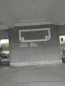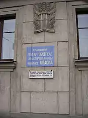 Мемориальная надпись «Граждане! При артобстреле эта сторона улицы наиболее опасна» с памятной доской при ней и полочкой для цветов