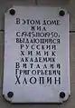 - Хлопин, Виталий Григорьевич[7] (1890—1950) — русский, советский химик, один из основоположников советской радиохимии и радиевой промышленности, получил первые отечественные препараты радия, один из ведущих участников Атомного проекта; действительный член АН СССР (1949), Герой Социалистического Труда (1939), один из основателей Радиевого института (ныне АО «Радиевый институт имени В. Г. Хлопина» (бывш. РИАН)). Жил с 1941 года: корпус № 1 (бывшая квартира № 150, перепланирована в начале 1980-х годов). Мемориальная доска — Жил в 1945—1950 годах.