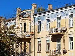 Асимметрия фасада усилена завершением левого эркера щипцом. В его поле помещено цветное майоликовое панно с изображением Пана со свирелью и нимф.
