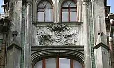 | Полукруглое окно-витраж — соединение модерна и готики[5] | Двустворчатая дверь с ажурными литыми перилами | Вытянутые прямоугольные окна, подчеркивая высоту и формируя с другими элементами ровные линии, придают архитектуре здания, в том числе и готический вид |