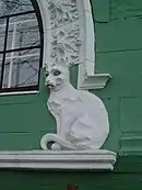 | Зеленоглазая кошка, стерегущая окно | Две совы над дверью | Чёрт или Химера на самом верху, под крышей | Фамильный герб, расположенный под Чёртом | Четыре мужских маскарона: 2 грустных, 2 злых |