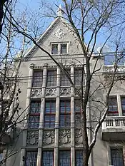 - Скульптурные элементы здания, помимо рыцарских гербов, химер, саламандр, волков, включают в себя также головы самого Покровского и его помощника техника-архитектора Величко. Их внесли в проект сёстры Покровские без ведома брата. Скульптуры архитекторов — относительно молодого Величко справа в виде средневекового студиозуса-писца и Покровского в очках слева в виде профессора-чтеца — и поныне, как каждый может видеть, выглядывают из-под балкона второго этажа.