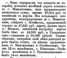 Вырезка из журнала "Нива" от 9 февраля 1876 года №6 - Согласно статье в журнале "Нива" от 9 февраля 1876 года № 6 на постройку Донецкой железной дороги проходил тендер, который выиграл господин Мамонтов, который стоимость одной версты железнодорожного полотна оценил в наименьшую сумму - 47,812 рублей.[5]