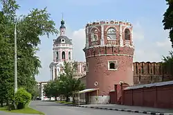 ![]() Западная стена монастыря, на заднем плане — надвратная колокольня, 2010 год | |