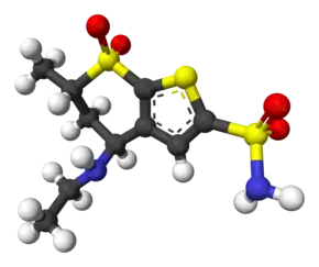 Дорзоламид (торговое название Трусопт ) является ингибитором карбоангидразы. Это антиглаукомный агент, снижающий секрецию внутриглазной жидкости.[1] Он применяется в виде 2 % глазных капель.[2]