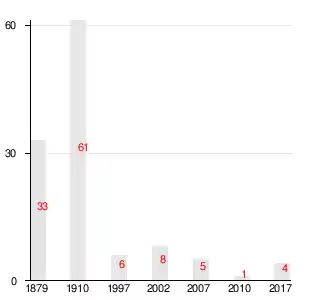 Число жителей по семейным спискам 1879 г.: 15 м. п., 18 ж. п.; по приходским сведениям 1879 г.: 15 м. п., 22 ж. п.[3]