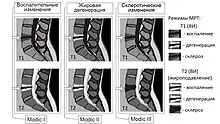 Для восприятия целостной картины патофизиологических процессов, происходящих в замыкательных пластинках тел позвонков, вплотную прилежащих к межпозвонковым дискам, также важным является классификация МРТ изменений костного мозга тел позвонков по Modic[17].