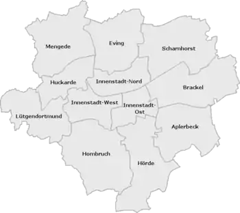 Дортмунд состоит из 12 городских округов (stadtbezirk): трёх центральных и кольца из девяти остальных.