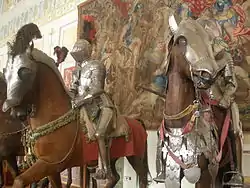 Обычно сохранялся и щит, предназначенный для активного принятия ударов противника и защиты от стрел, который в Европе к XVI веку практически вышел из употребления, так как новые техники фехтования позволили обходиться без него в ближнем бою на мечах, удар копья стали принимать непосредственно на кирасу, а стрелы обладателю латника уже не были особо страшны.