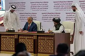 ![]() Представитель США Залмай Халилзад (слева) и представитель «Талибана» Абдул Гани Барадар (справа) подписывают соглашение | |