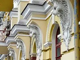 Распространенными элементами декора были маскароны, кариатиды, атланты, ифриты, гермы. Маскароны, изображения «античного» лица мужчины или женщины, обычно содержатся в замковых камнях оконных или дверных перемычек, на лопатках, пилястрах или в свободном поле стены (Лютеранская, 36/7; Заньковецкой, 7; Шота Руставели, 22; Большая Житомирская, 8-А, 10, 38; Сечевых Стрельцов, 7,12; Николаевская, 15, 19; Назаровская, 19, 21; Ярославов Вал, 37/1; Рейтарская, 7, 20/24, 29; Владимирская, 30, 82; Гоголевская, 10).