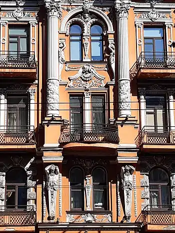 К заметным образцам разработки фасадов в стиле модерн с использованием элементов исторических стилей относятся доходные дома на Малой Владимирской, 74 архитектора Павла Алешина (1911); Рейтарской, 20/24 архитектора Александра Вербицкого (1912); Большой Житомирской, 8-я Михаила Бобрусова (1909—1913).