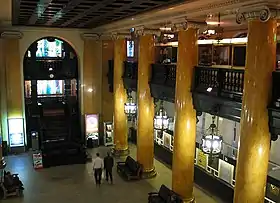 Крупномасштабностью и повышенной декоративностью обладает интерьер операционного зала. Колонны и пилястры ионического ордера отделаны искусственным мрамором жёлтого цвета. Активную роль играют резной кессонированный плафон потолка и бронзовые люстры оригинальной формы[4].