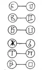 Правда школы у вендов были в плохом состоянии, тем не менее их учителя-священнослужители наряду со своими буквами пользовались руническими письменами следующего облика.