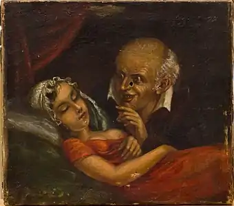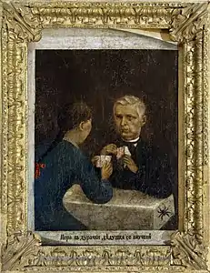 Другой картиной, не менее остро запечатлевшей психологический и социальный конфликт, связанный с положением женщины низкого сословия, стала «Помещик и горничная» (1870-е — 1880-е годы). Небольшой холст был чудом обнаружен в 1930 году в сенцах дома в слободке Ларьково и находится в плохом состоянии. Здесь художник создал шаржированный образ лысого седого помещика, вожделенно тянущегося к спящей девушке[11][16].