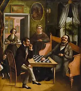 «Игра купца с гостем в шашки» («Сватовство невесты»). Картон, масло. 68 х 59,2 см.