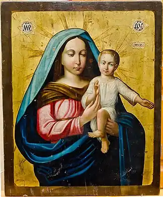 До наших дней сохранилась, хотя и сильно поврежденной, одна из ранних икон художника, написанная им в 28 лет «Ветхозаветная Троица» («Гостеприимство Авраама», 1840)[14]. К зрелому периоду творчества относится икона «Богоматерь с младенцем» (не позднее середины 1870-х). В иконе прослеживается народная традиция: покой, мягкость и добросердечие[10].