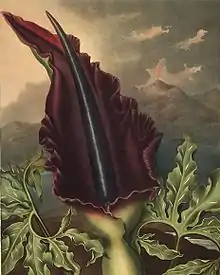 Растение цветёт весной, до распускания листьев. Цветки мелкие, собраны в початок — как и у других представителей семейства Ароидные. Характерная особенность растений этого рода — вертикально расположенное сильно вытянутое соцветие-початок, в длину достигающее 40 см при диаметре в несколько сантиметров. Окраска початка может быть разной — от красной до почти чёрной. Соцветие, помимо початка, состоит из листа-покрывала, внешняя сторона которого имеет зелёный цвет, цвет же внутренней стороны, в зависимости от сорта, может быть и ярко-красным, и красно-пурпуровым, и даже практически чёрным. Цветки издают запах гниения, который привлекает опылителей, например мух[2][3].