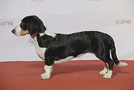 Таксообразная собака с длинным корпусом и короткими ногами; скорее крепкая, чем элегантная, очень мускулистая, с горделивой осанкой. Голова крупная по сравнению с корпусом, удлинённая и слегка заострённая. Нос чёрный, глаза ясные и выразительные. Некрупные висячие уши посажены низко, кончики ушей закруглены. Спина ровная и сильная, хвост толстый у основания, не должен нестись выше уровня спины.