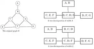 Ширина древесной декомпозиции — это размер её наибольшего множества Xi без единицы. Древесная ширина tw(G) графа G — это минимальная ширина среди всех возможных декомпозиций графа G. В этом определении размер наибольшего множества уменьшен на единицу с целью сделать древесную ширину дерева равной единице. Древесную ширину можно определить исходя из других структур, а не древесной декомпозиции. Сюда входят хордальные графы, ежевики и гавани.