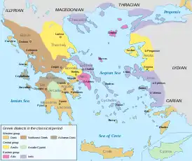 Древние греки считали, что их народ делится на три племени: дорийцев, эолийцев и ионийцев; каждая из народностей говорила на своём, отличном от других, наречии. Если опустить факт отсутствия в этой классификации малоизвестных аркадского и кипрского диалектов, (развившихся из микенского языка, на котором в древности говорило племя ахейцев), потерявших былую значимость после дорического завоевания Пелопоннеса, практически неизвестных в культурных центрах Античной Греции в классический период, в целом это деление верно и совпадает с результатами современных археологических и лингвистических исследований.