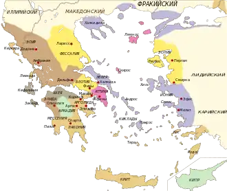 | Западная группа: Дорийский Северо-западный | Центральная группа: Эолийские Аркадо-кипрский | Восточная группа: Аттический Ионийские |