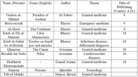 Одной из основных ролей, которую играли средневековые иранские ученые в области науки, было сохранение, консолидация, координация и развитие идей и знаний в древних цивилизациях. Некоторые иранские хакимы (практикующие врачи), такие как Мухаммад ибн Закария ар-Рази, известный на Западе как Разес, и Ибн Сина, более известный как Авиценна, не только собирали всю существующую информацию о медицине того времени, но и дополняли это знание путём их собственных проницательных наблюдений, экспериментов и навыков.[18][19] «Канун фел теб Авиценны» («Канон») и «Китаб аль-Хави из Рази» («Континенс») были одними из центральных текстов в западном медицинском образовании с XIII по XVIII века.[20][21]