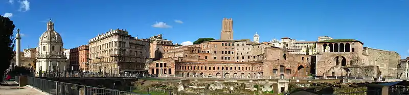 В Древнем Риме торговля проходила на форумах[10]. Форум Куппединис в древнем Риме был рынком, на котором торговали обычными товарами. Существовало по крайней мере четыре других крупных рынка, которые специализировались на конкретных товарах, таких как крупный рогатый скот, вино, рыба и зелень и овощи, но Римский Форум привлекал основную часть торговли. Римские форумы включали, Форум Boarium и Форум Траяна. Форум Boarium, один из ряда рынков и продуктов питания, возник, как рынок крупного рогатого скота. Форум Траяна был обширным пространством, состоящим из нескольких зданий с магазинами на четырёх уровнях. Римский форум был, пожалуй, самым ранним примером постоянного розничного магазина. Типичной формой магазина была таберна[11]: небольшое прямоугольное помещение на уровне земли с широким входом, обращённым к улице. При необходимости вход закрывался деревянными досками-ставнями, вставляемыми в пазы, прорезанные в пороге и притолоке, и закрепляемыми железным стержнем, протягиваемым через ввёрнутые в доски кольца[12].