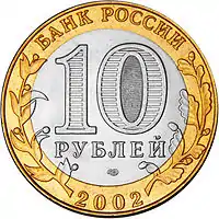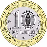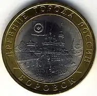 В июне 2002 года Центральный банк Российской Федерации выпускает новые биметаллические монеты, начав тем самым новую серию «Древние города России». Серия относится к памятным монетам из недрагоценных металлов — до 2016 года объединения двух цветов, которые дают сплавы латуни и мельхиора, с 2017 года — сталь с латунным и никелевым гальваническим покрытием.