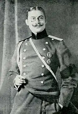![]() В. Н. фон Дрейер в чине капитана во время службы в III-м армейском корпусе (Вильно) под началом генерал-лейтенанта П. К. фон Ренненкампфа. Фотография, 1910 г. | |