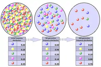 Однако в конечных популяциях новые аллели не получены в результате случайной выборки аллелей, переданной следующему поколению, но выборка может привести к исчезновению существующего аллеля. Поскольку случайная выборка может удалить, но не заменить аллель, и поскольку случайное снижение или увеличение частоты аллелей влияет на ожидаемое распределение аллелей для следующего поколения, генетический дрейф ведет популяцию к генетической однородности с течением времени. Когда аллель достигает частоты 1 (100 %), она считается «фиксированной» в популяции, а когда аллель достигает частоты 0 (0 %), она исчезает. Меньшие популяции достигают фиксации быстрее, тогда как в пределе бесконечной популяции фиксация не достигается. Как только аллель становится фиксированной, генетический дрейф останавливается, и частота аллеля не может измениться, если новый аллель не введен в популяцию посредством мутации или потока генов. Таким образом, даже несмотря на то, что генетический дрейф является случайным, бесцельным процессом, он устраняет генетические изменения во времени[15].