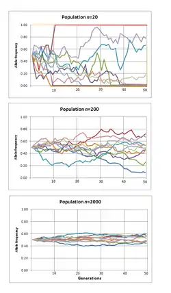 Закон больших чисел предсказывает, что, когда абсолютное число копий аллеля мало (например, в маленьких популяциях), величина дрейфа на частотах аллеля на поколение больше. Величина дрейфа достаточно велика, чтобы подавить отбор при любой частоте аллеля, когда коэффициент отбора меньше 1, деленного на эффективный размер популяции. Поэтому считается, что не адаптивная эволюция, возникающая в результате мутации и генетического дрейфа, является последующим механизмом эволюционных изменений, главным образом в небольших изолированных популяциях[19]. Математика генетического дрейфа зависит от эффективного размера популяции, но неясно, как это связано с фактическим числом особей в популяции[20]. Генетическая связь с другими генами, которые находятся в процессе отбора, может уменьшить эффективный размер популяции, испытываемый нейтральным аллелем. При более высокой частоте рекомбинации уменьшается связь, и вместе с этим это локальное влияние на эффективный размер популяции[21][22]. Этот эффект виден в молекулярных данных как корреляция между локальной скоростью рекомбинации и генетическим разнообразием[23] и отрицательной корреляцией между плотностью и разнообразием генов в некодирующих областях ДНК[24]. Стохастичность, связанная со связью с другими генами, находящимися в процессе отбора, не является той же ошибкой, что и выборка, и иногда её называют генетической тягой, чтобы отличить её от генетического автостопа[20].