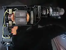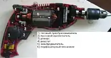 - электронная регулировка скорости осуществляется с помощью реостата, который управляется изменением нажатия на кнопку выключателя — чем глубже вдавлена кнопка, тем выше скорость. Часто на кнопке располагается колёсико, которым выставляется ограничение максимальной скорости. При понижении скорости электронным способом выходная мощность снижается. В настоящее время от реостатного управления с большим выделением тепла на реостате перешли к тиристорному управлению мощностью с меньшим выделением тепла.