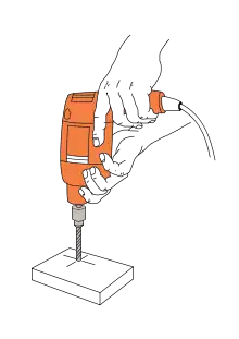 - при работе с твёрдыми поверхностями и вязкими материалами держать дрель двумя руками, особенно при работе с мощными моделями;
