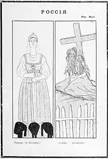 Особенно это коснулось образа России, превратившейся <…> из процветающей страны (представленной в виде красивой сильной женщины в национальном костюме) в иссохшуюся старуху в лохмотьях, избитую и изуродованную большевиками[13].