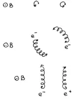 «Включим» теперь электростатическое отталкивание между электронами. В пустом пространстве, электроны разлетелись бы прочь друг от друга. Однако, в нашем случае магнитное поле не допустит разлёта. Вместо этого электроны начнут медленно дрейфовать друг вокруг друга (см. средний рисунок). Если же у нас был бы электрон и позитрон, то есть, притягивающиеся частицы, то и они начали бы дрейфовать, но только параллельно друг другу (см. нижний рисунок).