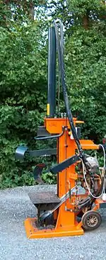 - вертикальные. Бревно устанавливается вертикально, сверху на него толкается нож (при помощи гидроцилиндра). КПД данных станков выше, нежели у горизонтальных, поскольку бревно во время раскола не движется и не создает дополнительного трения. Однако при работе с криво отпиленными чурбаками (как это часто происходит в России) приходится удерживать их вручную, что ведет к нарушениям техники безопасности.