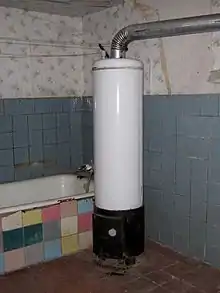 Напольный водонагреватель, снабжающий водой ванну и душ, также именуется водогрейной колонкой за свою форму стоячего цилиндра.