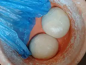 Когда опара увеличится в объёме в 2 раза и начнет опадать, к ней добавляют оставшуюся жидкость с растворенными солью и сахаром, яйца, все перемешивают, вводят муку и замешивают тесто. Перед окончанием замеса добавляют размягчённый жир. Тесто накрывают тканью и оставляют для брожения ещё на 2-3 часа.