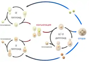 Гаплоидные аскомицетные дрожжевые клетки имеют два типа спаривания: a и α. Термин «пол» не используется, поскольку клетки морфологически идентичны и различаются только одним генетическим локусом mat (от англ. mating — спаривание). Клетки разных типов могут сливаться и образовывать диплоид a/α, который после мейоза даёт 4 гаплоидных аскоспоры: две a и две α. Вегетативное размножение аскомицетных дрожжей возможно у разных видов либо только на гаплоидной стадии, либо только на диплоидной, либо на обеих (гапло-диплоидные дрожжи)[33].