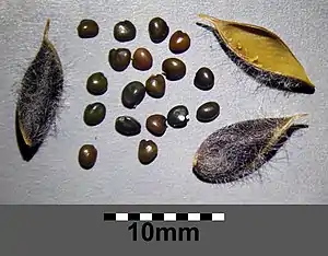 Плоды бобовидные, продолговатые, длиной 8–12 мм и шириной 4–5 мм, мохнато-волосистые. Созревают в начале октября, причём их созревание происходит параллельно с ростом побегов, который продолжается до наступления заморозков; поэтому побеги одревесневают лишь на 25—75 % и ежегодно обмерзают, однако куст снова восстанавливается и цветет.