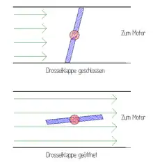 В системе впрыска топлива дроссельная заслонка представляет собой отдельный узел, стоящий в воздушном тракте последовательно и дозирующий количество воздуха на входе в коллектор. Дело в том, что соотношение «бензин — воздух» в цилиндре впрыскового двигателя должно оставаться стехиометрическим, то есть, система управления должна иметь возможность при работе двигателя на неполных режимах ограничивать не только подачу топлива, но и подачу воздуха.