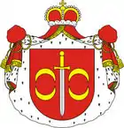 | Щит | В червлёном поле обращённый остриём вниз серебряный меч с золотым эфесом; по обеим сторонам которого четыре золотых полумесяца, по два с каждой стороны, обращённые рогами друг к другу. |