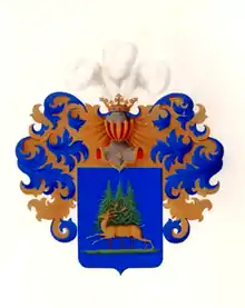В лазоревом поле, золотой бегущий олень, перед тремя натурального цвета ёлками.