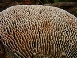 Гименофор состоит из трубочек, у края почти округлых, ближе к основанию — пластинковидных и образующих лабиринт. Стенки пор 1—3 мм толщиной, сами поры 1—4 мм в диаметре. Окраска гименофора светло-буроватая, иногда на нём наблюдается беловатый налёт.